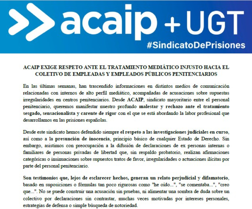 COMUNICADO DE ACAIP ANTE EL TRATAMIENTO MEDIÁTICO AL COLECTIVO DE PRISIONES