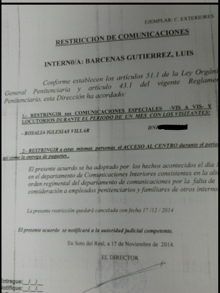 De indéntica duración es la que impusieron en septiembre pasado a A.A., por la actitud de su hermano. Según el parte que dio lugar a esta sanción, de sólo un párrafo de extensión frente a los dos folios del redactado tras el altercado de Rosalía Iglesias, el familiar no tenía autorización para dicho encuentro, que estaba restringido a la mujer y al hijo del recluso, por lo que se enfrentó a una funcionaria, a la que tildó a voces de "borde" y "chula". "Se le indica que se retire de la ventanilla haciendo caso omiso, continuando con insultos y actitud chulesca diciéndome 'qué cojones tienes pedazo de puta", se lee en el informe de Instituciones Penitenciarias. Dicho suceso provocó el retraso en la entrada a los 'vis a vis' de los familiares de otros reclusos, lo que provocó "gran alteración" entre éstos. La sanción: seis meses. Estará en vigor hasta el 29 de marzo de 2015.