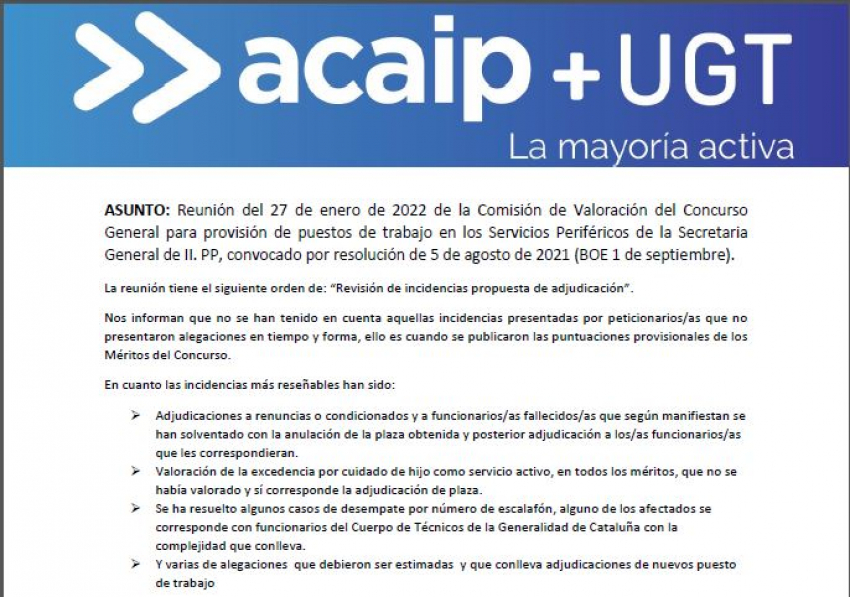 ACAIP+UGT insistimos en que los méritos que no aportan y que están en poder de la Administración, deberían ser valorados en cualquier estado del concurso, toda vez se trata de errores de la Administración, y debería resolver de oficio. Manifiestan que lo hubiesen alegado en tiempo y forma, por lo que reiteramos la IMPORTANCIA DE REVISAR Y ALEGAR EN TIEMPO Y FORMA.