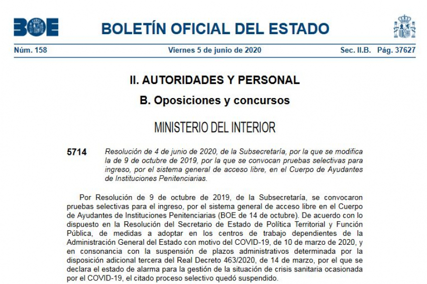 Resolución de 4 de junio de 2020, de la Subsecretaría, por la que se modifica la de 9 de octubre de 2019, por la que se convocan pruebas selectivas para ingreso, por el sistema general de acceso libre, en el Cuerpo de Ayudantes de Instituciones Penitenciarias.