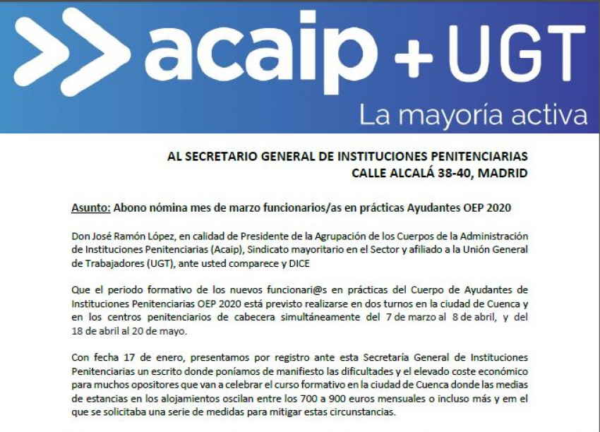 El cierre de nóminas que se realizan en los centros penitenciarios es actualmente el día 5 de cada mes, por lo que los compañeros en prácticas no percibirían el sueldo correspondiente al mes de marzo hasta finales de abril, lo que supondría un grave problema económico para muchos de ello.