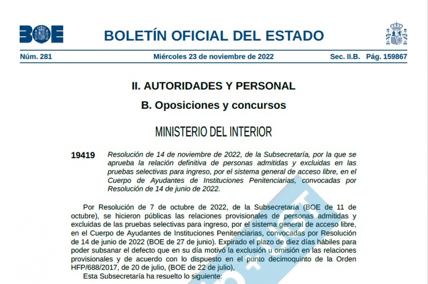 Resolución de 14 de noviembre de 2022, de la Subsecretaría, por la que se aprueba la relación definitiva de personas admitidas y excluidas en las pruebas selectivas para ingreso, por el sistema general de acceso libre, en el Cuerpo de Ayudantes de Instituciones Penitenciarias, convocadas por Resolución de 14 de junio de 2022.