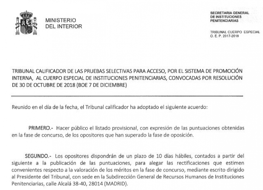 SEGUNDO.- Los opositores dispondrán de un plazo de 10 días hábiles, contados a partir del siguiente a la publicación de las puntuaciones, para alegar las rectificaciones que estimen convenientes respecto a la valoración de los méritos en la fase de concurso, mediante escrito dirigido al Presidente del Tribunal, con sede en la Subdirección General de Recursos Humanos de Instituciones Penitenciarias, calle Alcalá 38-40, 28014 (MADRID).