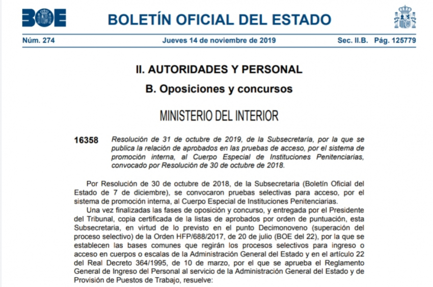 Resolución de 31 de octubre de 2019, de la Subsecretaría, por la que se publica la relación de aprobados en las pruebas de acceso, por el sistema de promoción interna, al Cuerpo Especial de Instituciones Penitenciarias, convocado por Resolución de 30 de octubre de 2018.