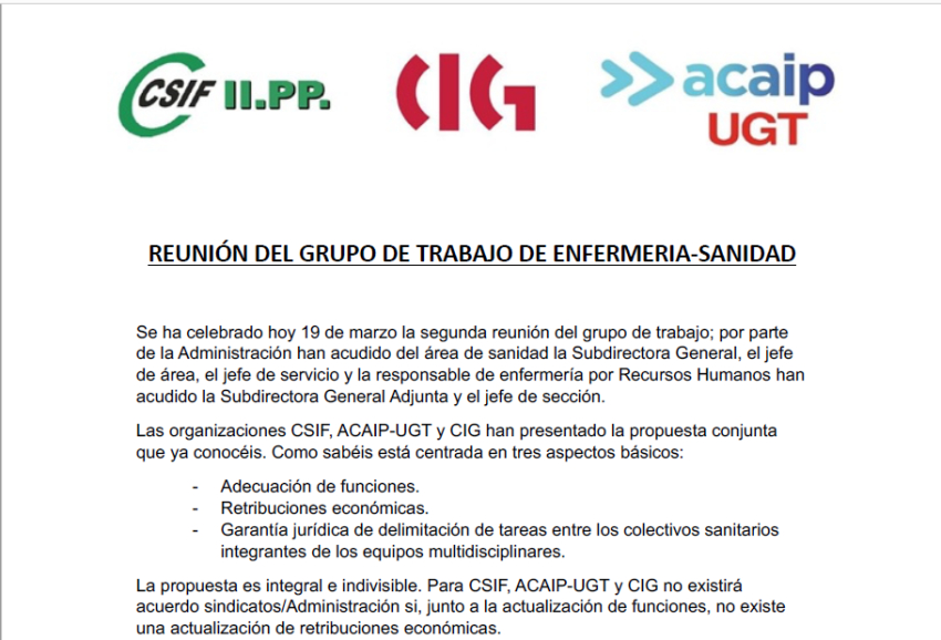 Las organizaciones CSIF, ACAIP-UGT y CIG han presentado la propuesta conjunta que ya conocéis. Como sabéis está centrada en tres aspectos básicos: