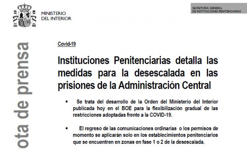 Se adjunta NOTA DE PRENSA enviada en el día de hoy por la Secretaria General de Instituciones Penitenciarias sobre la desescalada en nuestro ámbito
