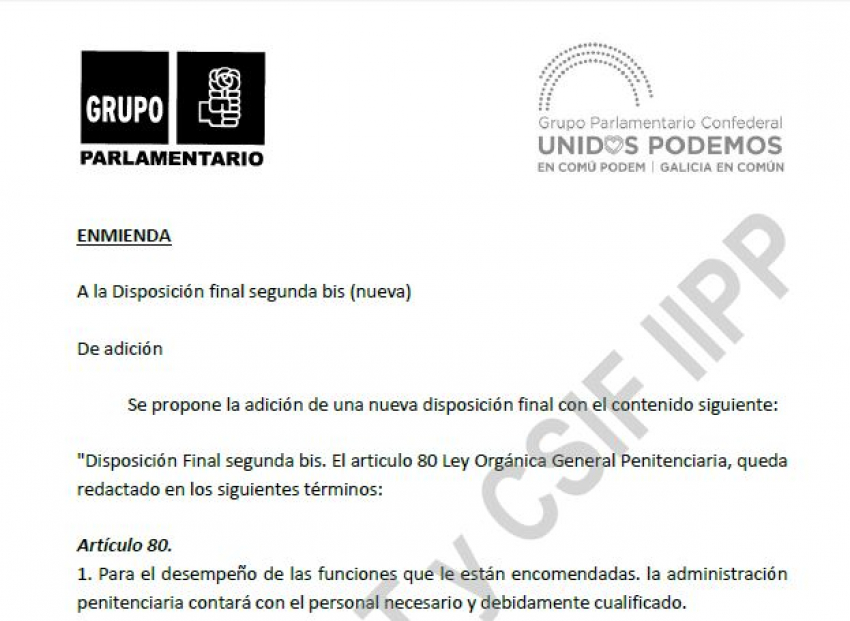 En el día de hoy, estos grupos parlamentarios han presentado una enmienda en la tramitación de la PROPOSICIÓN DE LEY ORGÁNICA de reforma de la Ley Orgánica 4/2015, de 30 de marzo, de protección de la seguridad ciudadana. (Núm. expte. 122/000003) (“Ley Mordaza”), por la que se pretende modificar el artículo 80 de la Ley Orgánica General Penitenciaria.