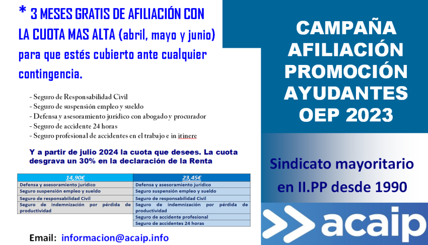 Debéis de cumplimentar tanto la hoja de afiliación como la hoja de datos que os adjuntamos mas abajo firmadas. Ambas hojas debéis de enviarlas al email : Esta dirección de correo electrónico está siendo protegida contra los robots de spam. Necesita tener JavaScript habilitado para poder verlo. donde recibiréis un e-mail con las coberturas de la promoción. A toda la promoción de la OEP 2023 os obsequiaremos con un detalle y a los que se afilien con nosotros además una cartera de piel de cortesía como bienvenida.