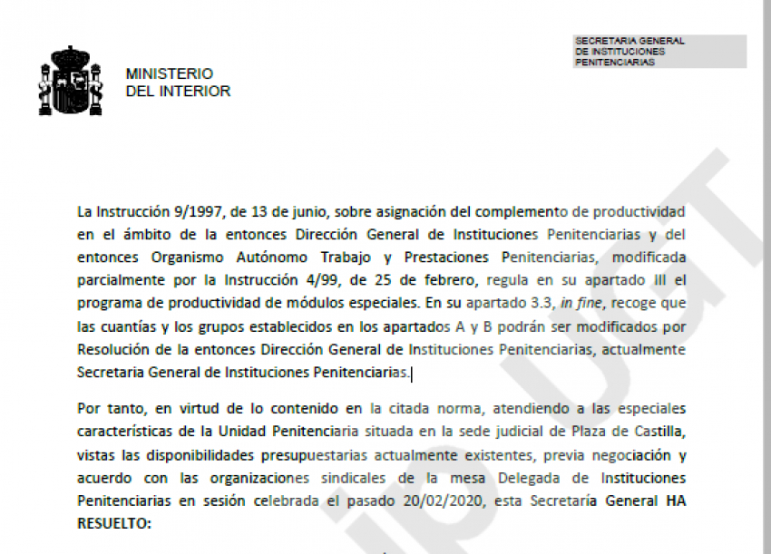 Por tanto, en virtud de lo contenido en la citada norma, atendiendo a las especiales características de la Unidad Penitenciaria situada en la sede judicial de Plaza de Castilla, vistas las disponibilidades presupuestarias actualmente existentes, previa negociación y acuerdo con las organizaciones sindicales de la mesa Delegada de Instituciones Penitenciarias en sesión celebrada el pasado 20/02/2020, esta Secretaría General HA RESUELTO: