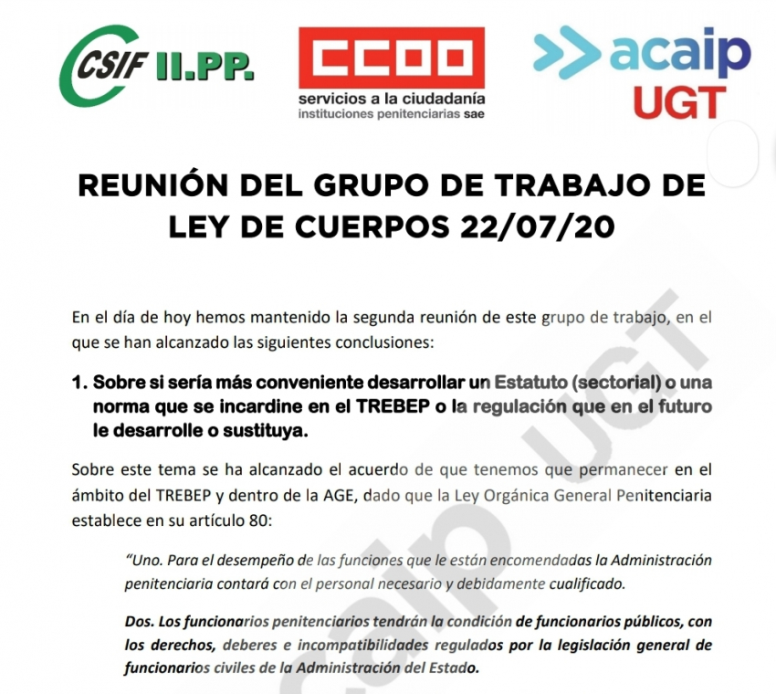 1. Sobre si sería más conveniente desarrollar un Estatuto (sectorial) o una norma que se incardine en el TREBEP o la regulación que en el futuro le desarrolle o sustituya. Sobre este tema se ha alcanzado el acuerdo de que tenemos que permanecer en el ámbito del TREBEP y dentro de la AGE, dado que la Ley Orgánica General Penitenciaria establece en su artículo 80: