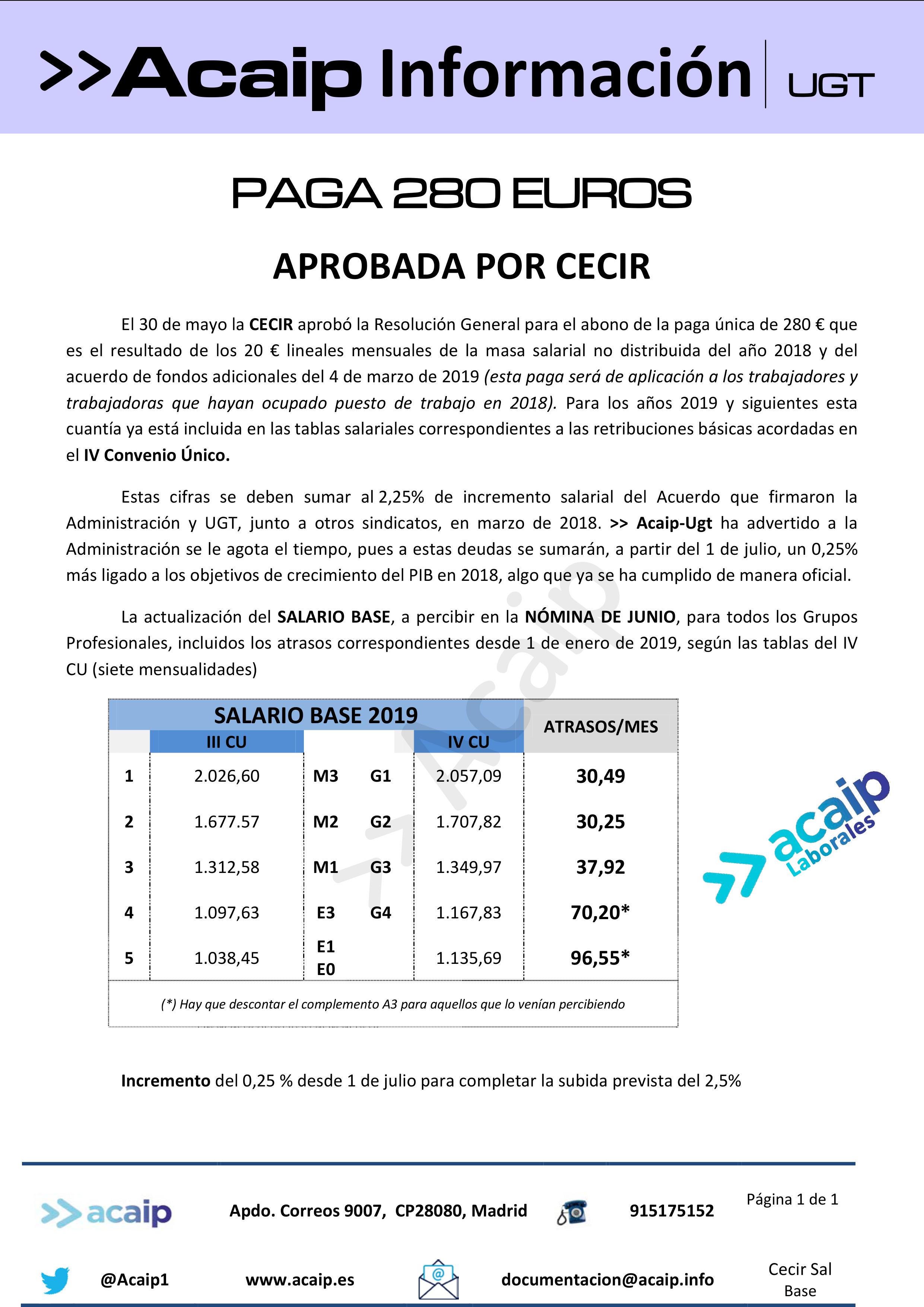 Aprobada por la CECIR paga unica de 280€ al para personal laboral.- Atrasos