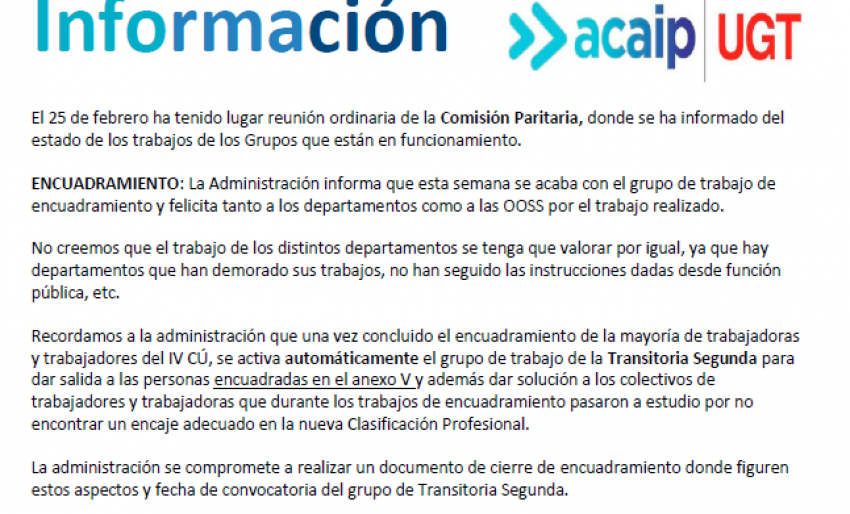 El 25 de febrero ha tenido lugar reunión ordinaria de la Comisión Paritaria, donde se ha informado del estado de los trabajos de los Grupos que están en funcionamiento. ENCUADRAMIENTO: La Administración informa que esta semana se acaba con el grupo de trabajo de encuadramiento y felicita tanto a los departamentos como a las OOSS por el trabajo realizado. No creemos que el trabajo de los distintos departamentos se tenga que valorar por igual, ya que hay departamentos que han demorado sus trabajos, no han seguido las instrucciones dadas desde función pública, etc.