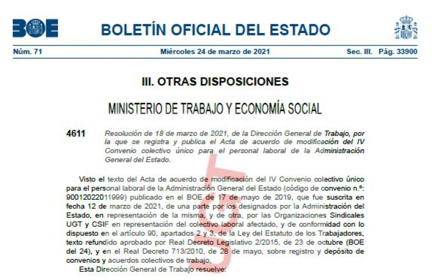 Resolución de 18 de marzo de 2021, de la Dirección General de Trabajo, por la que se registra y publica el Acta de acuerdo de modificación del IV Convenio colectivo único para el personal laboral de la Administración General del Estado.