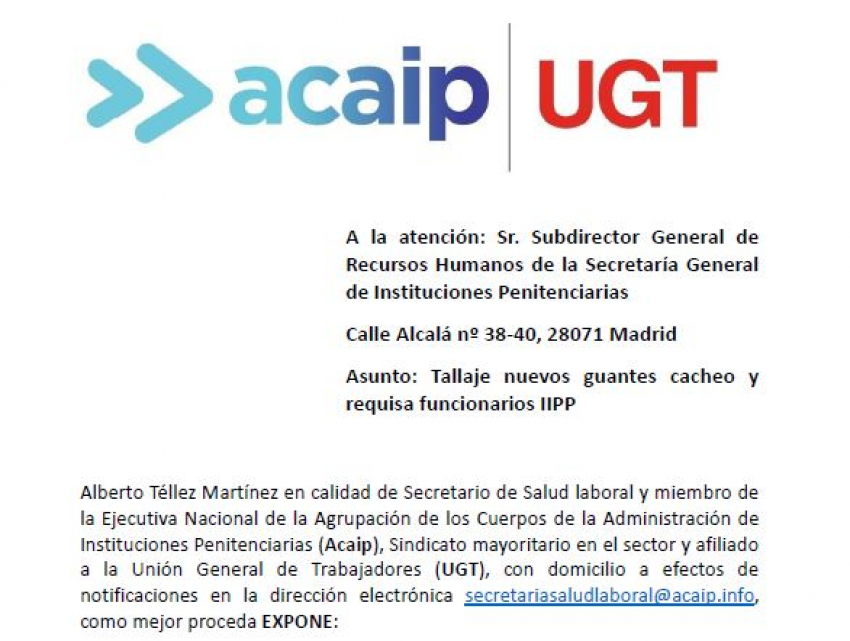 Alberto Téllez Martínez en calidad de Secretario de Salud laboral y miembro de la Ejecutiva Nacional de la Agrupación de los Cuerpos de la Administración de Instituciones Penitenciarias (Acaip), Sindicato mayoritario en el sector y afiliado a la Unión General de Trabajadores (UGT), con domicilio a efectos de notificaciones en la dirección electrónica Esta dirección de correo electrónico está siendo protegida contra los robots de spam. Necesita tener JavaScript habilitado para poder verlo., como mejor proceda