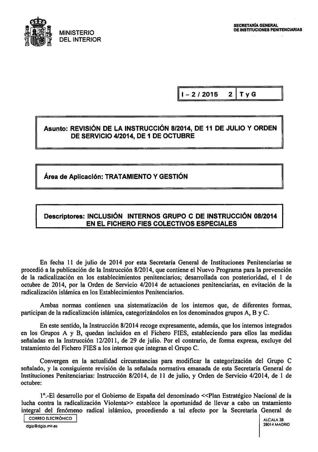 Instrucción 2/2015: INCLUSIÓN DE INTERNOS GRUPO C 08/2014 EN EL FICHERO DE FIES COLECTIVOS - page 1