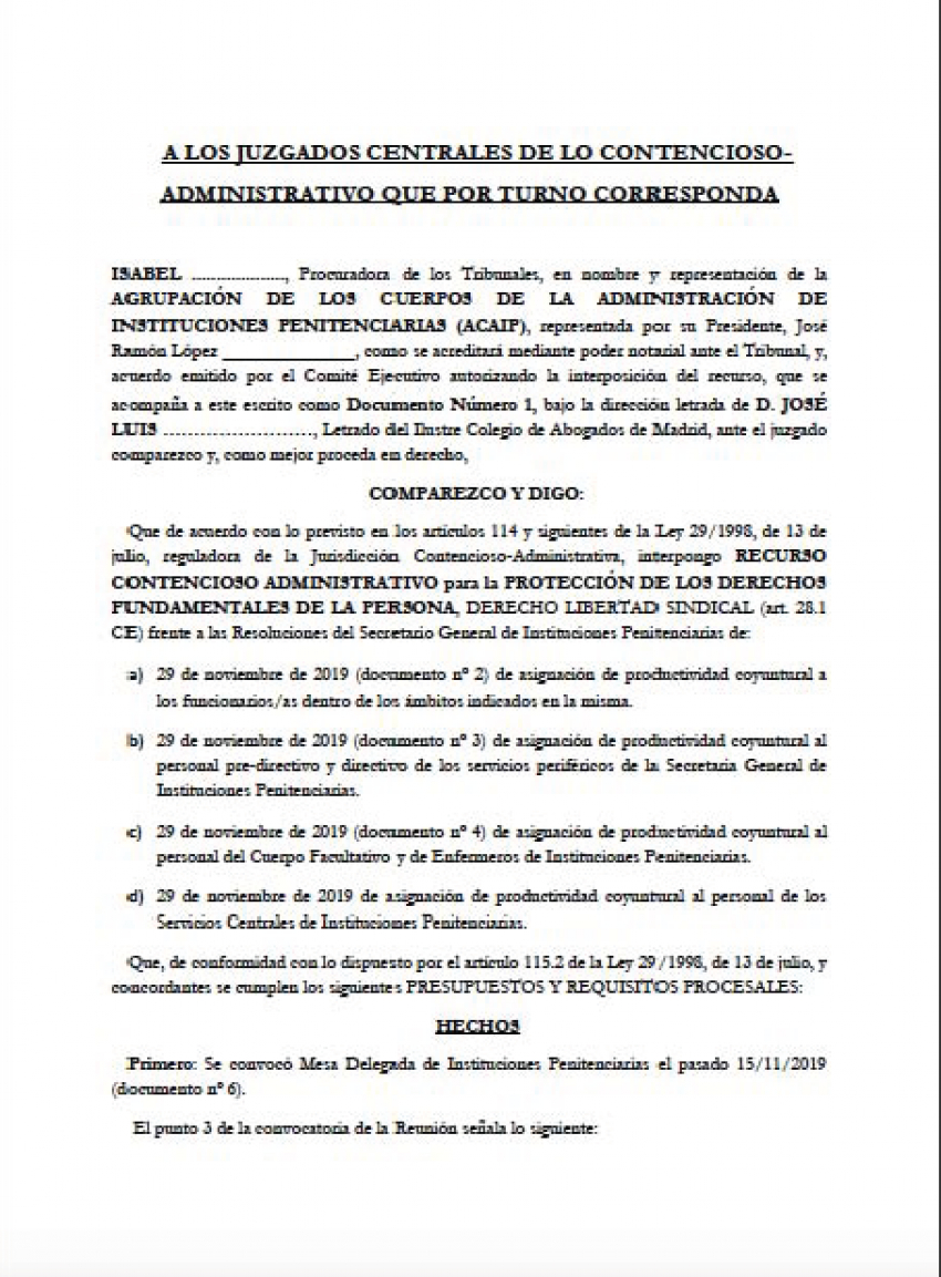 Agrega que tanto Instituciones Penitenciarias como las Direcciones del Centro Penitenciario de Valencia y del Centro de Inserción Social Torre Espioca "han denegado las peticiones de información sobre la identidad de estos perceptores realizadas por las organizaciones sindicales, entre ellas Acaip, y por la Junta de Personal de la Administración Periférica del Estado en la provincia de Valencia".