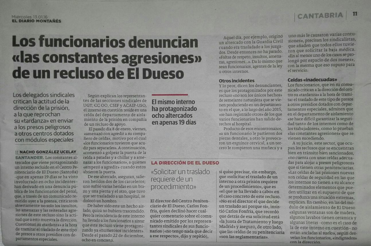 Fuente: Diario Montañes Los sindicatos denuncian las agresiones constantes, insultos y amenazas de un recluso. Al menos 8 altercados en menos de 19 dias.
