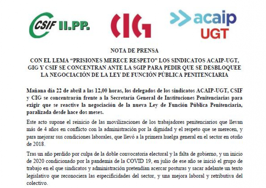 Mañana día 22 de abril a las 12,00 horas, los delegados de los sindicatos ACAIP-UGT, CSIF y CIG se concentrarán frente a la Secretaría General de Instituciones Penitenciarias para exigir que se reactive la negociación de la nueva Ley de Función Pública Penitenciaria, paralizada desde hace dos meses.