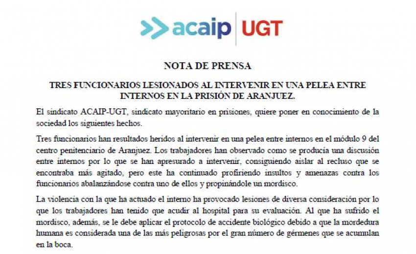 El sindicato ACAIP-UGT, sindicato mayoritario en prisiones, quiere poner en conocimiento de la sociedad los siguientes hechos.